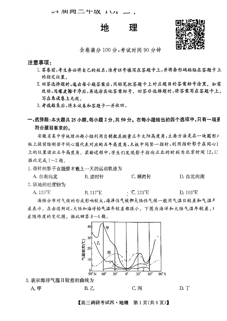 河南省TOP二十名校2024届高三上学期调研考试(四)地理