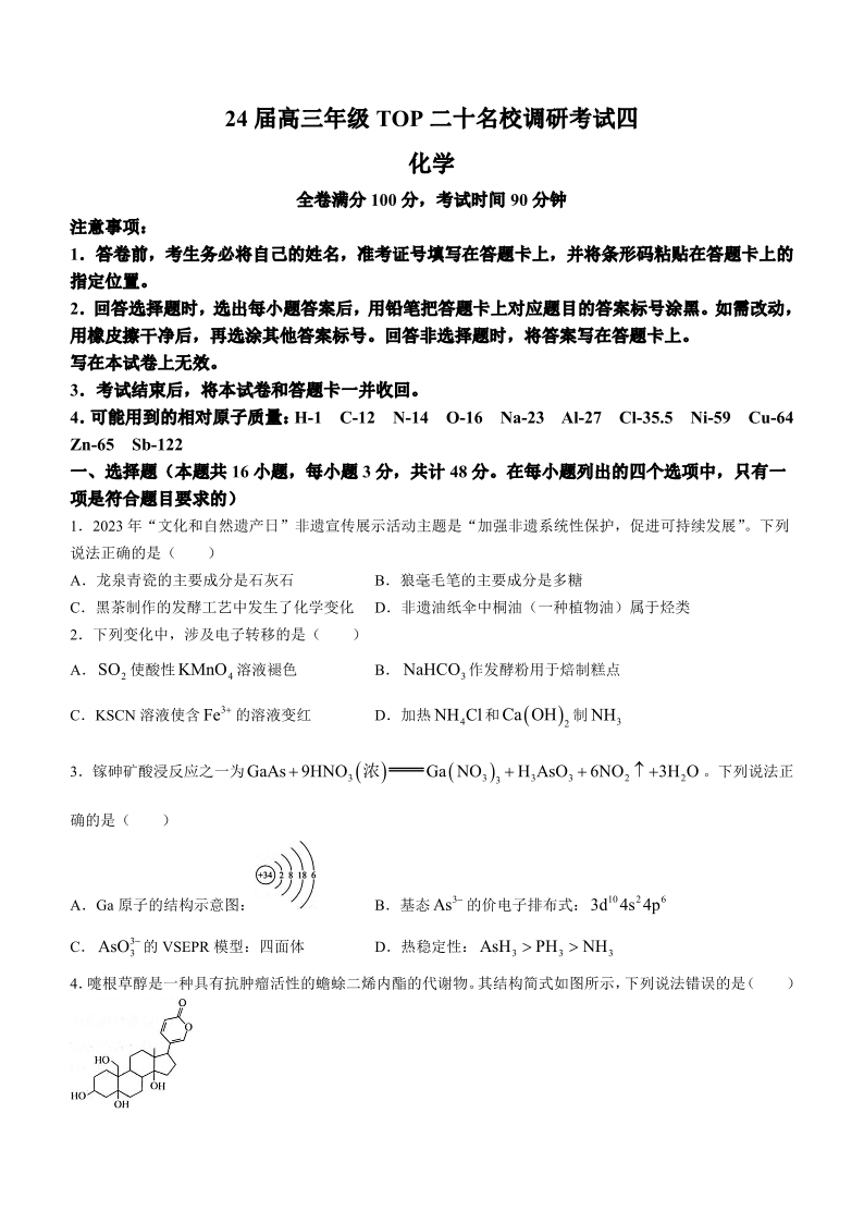 河南省TOP二十名校2024届高三上学期调研考试(四)化学