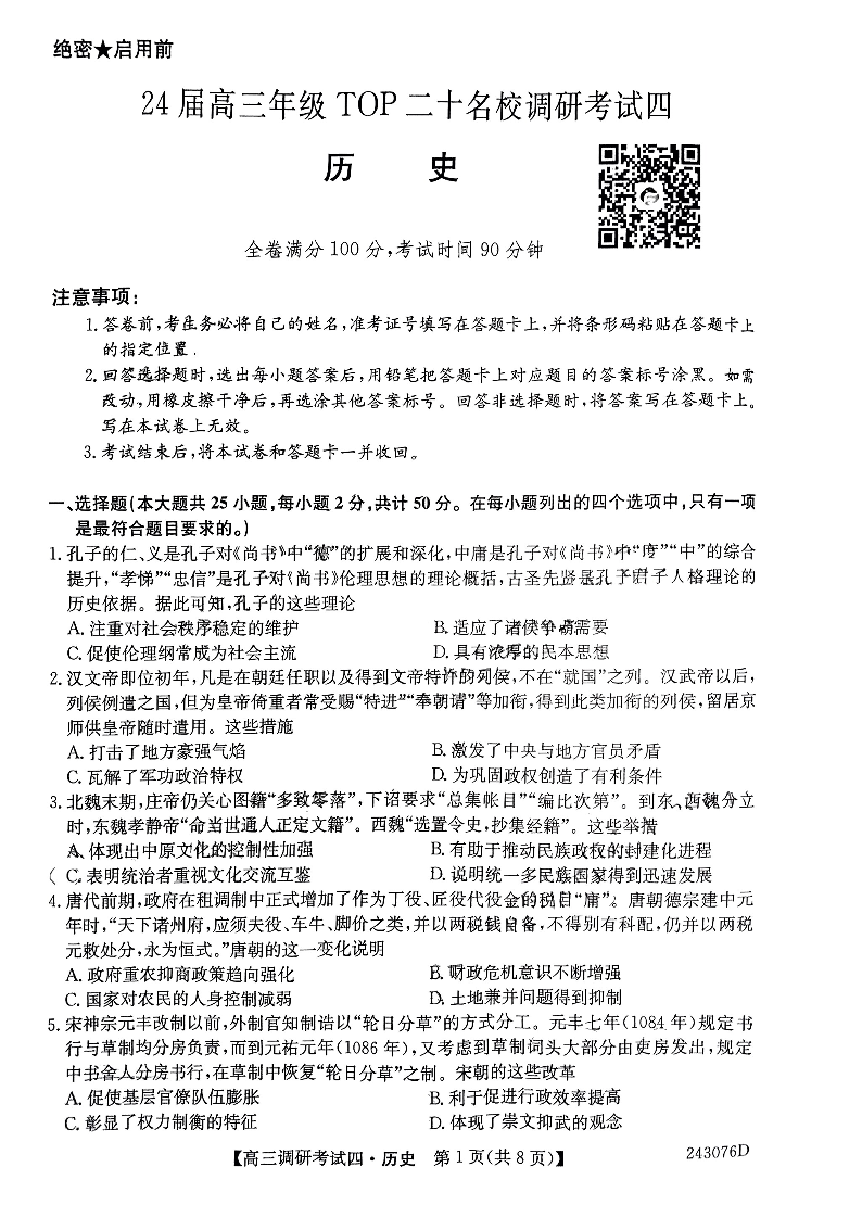 河南省TOP二十名校2024届高三上学期调研考试(四)历史