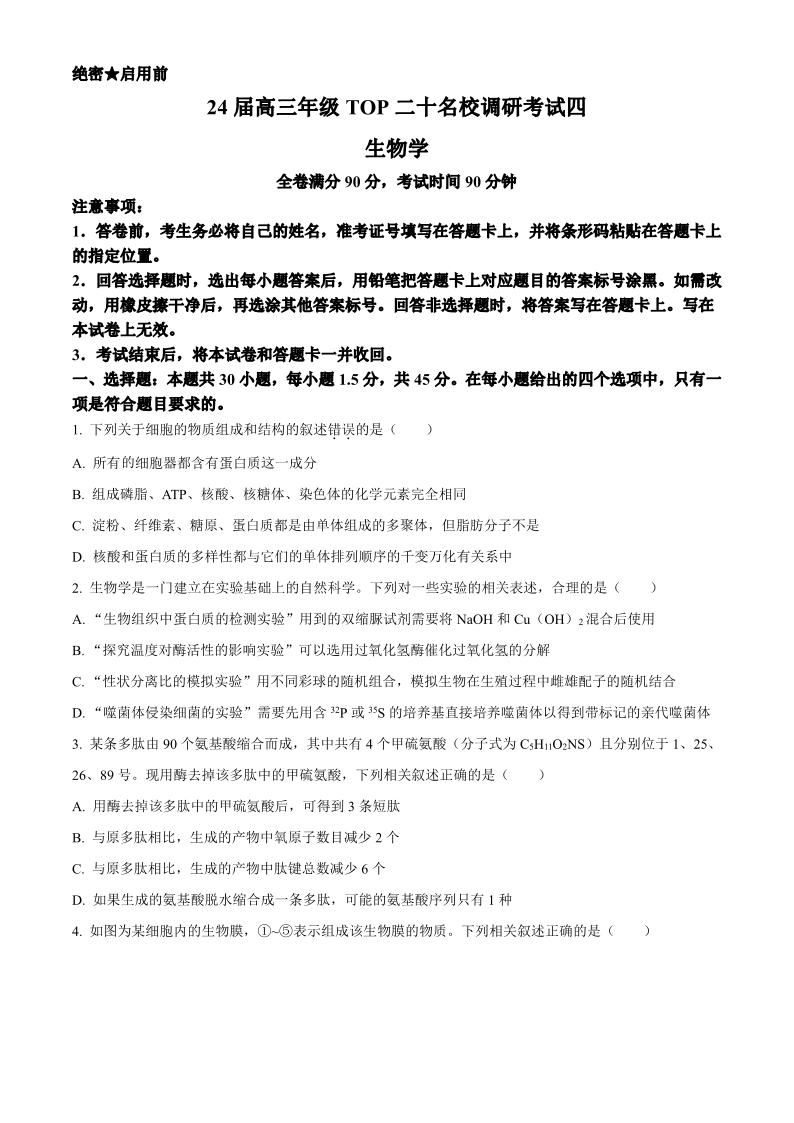 河南省TOP二十名校2024届高三上学期调研考试(四)生物