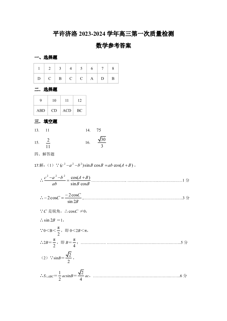 河南省平许济洛四市联考2023-2024学年高三上学期第一次质量检测 数学参考答案