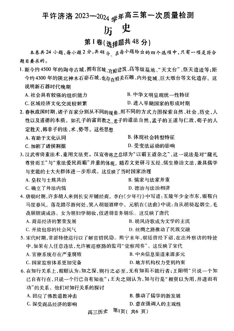 河南省平许济洛四市联考2023-2024学年高三上学期第一次质量检测 历史