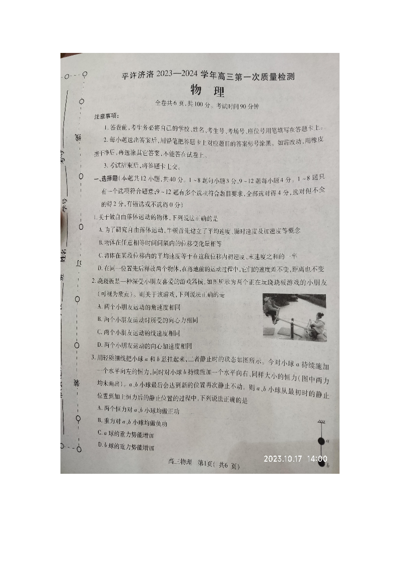 河南省平许济洛四市联考2023-2024学年高三上学期第一次质量检测 物理