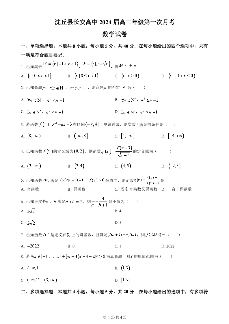 河南省沈丘县长安高级中学2024届高三上学期第一次月考 数学
