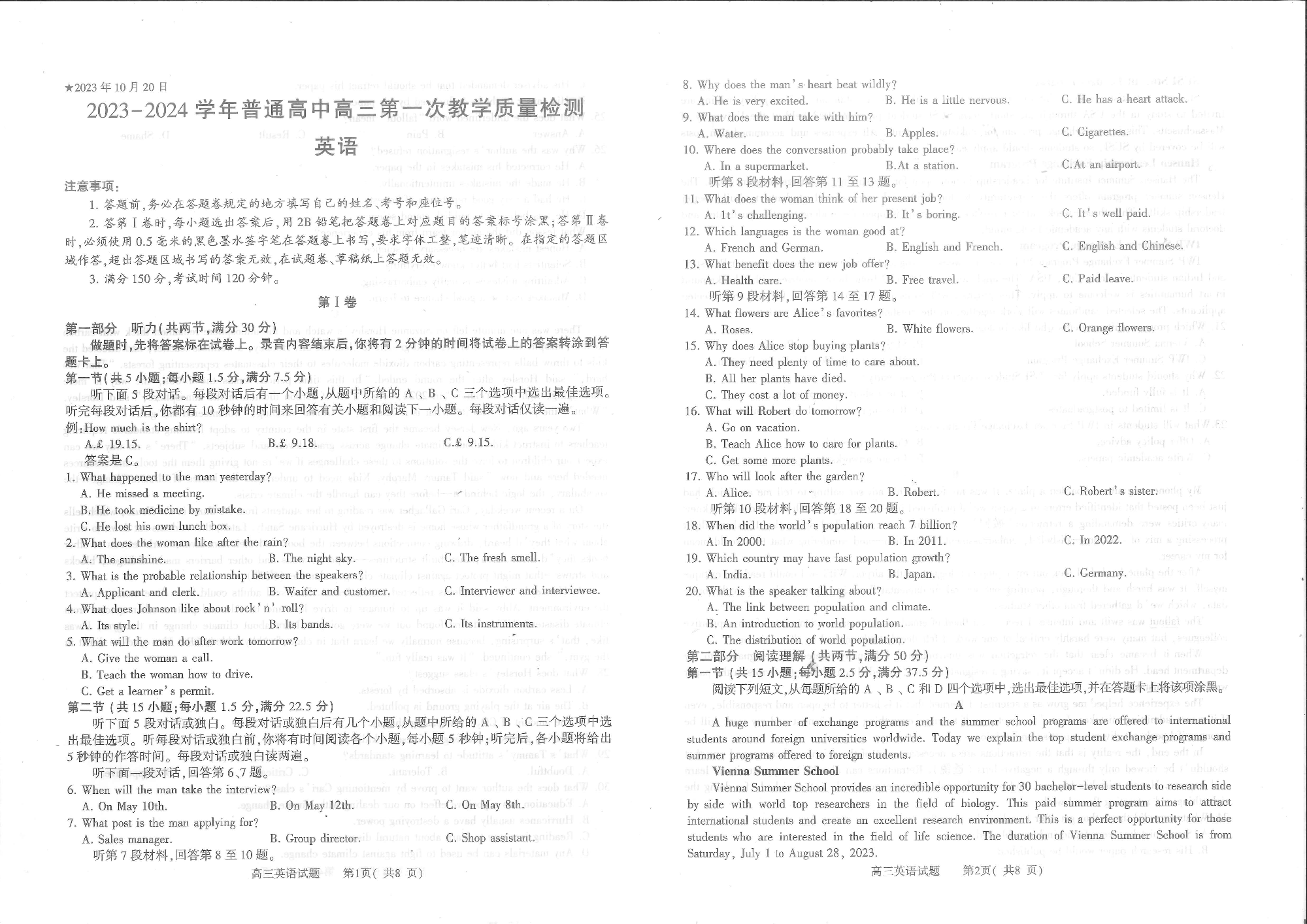 河南省信阳市2023-2024学年高三上学期第一次教学质量检测 英语