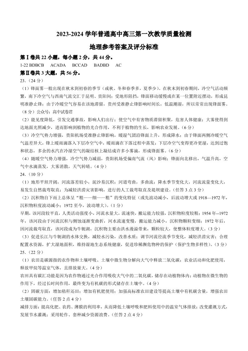 河南省信阳市2023-2024学年高三上学期第一次教学质量检测 地理答案