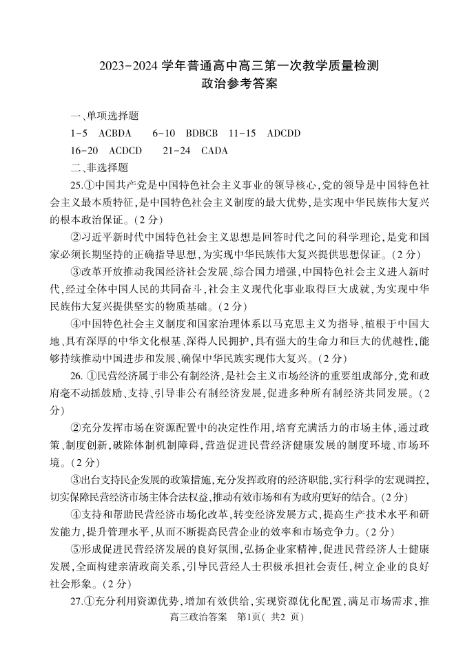 河南省信阳市2023-2024学年高三上学期第一次教学质量检测 政治答案
