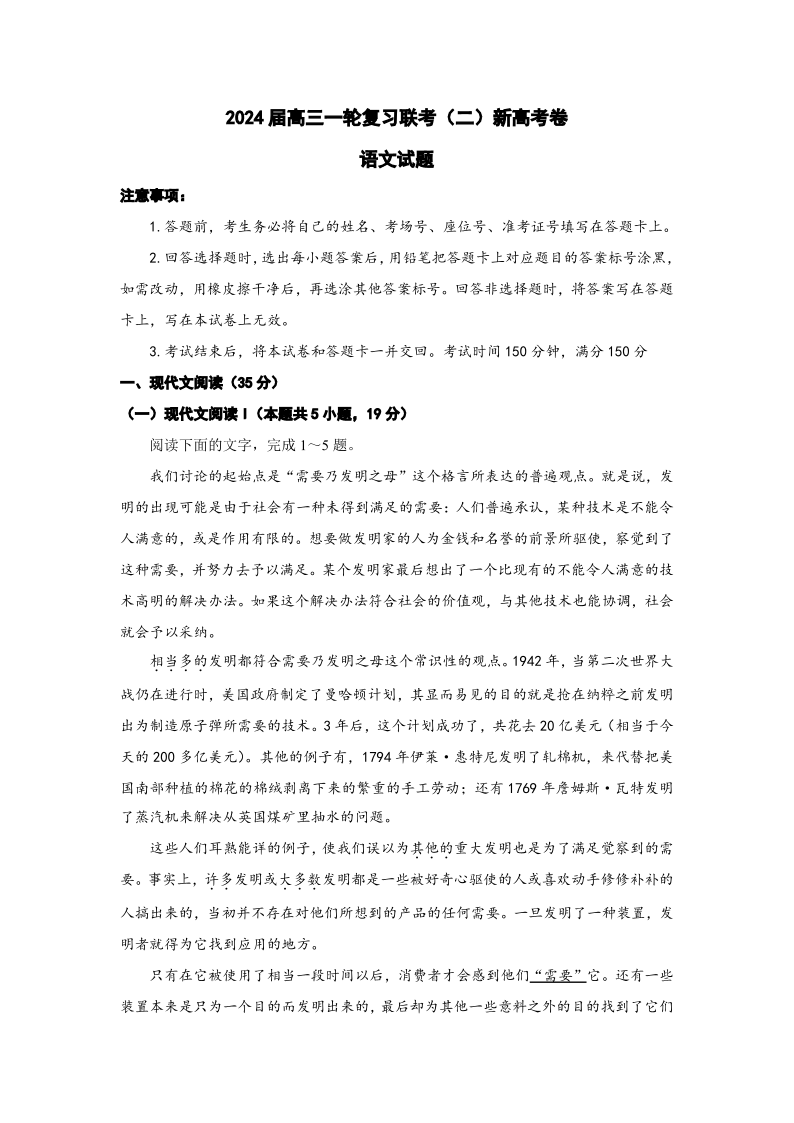 河南省豫北名校2024届高三毕业班一轮复习联考(二)语文