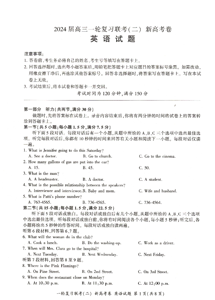 河南省豫北名校2024届高三毕业班一轮复习联考(二)英语