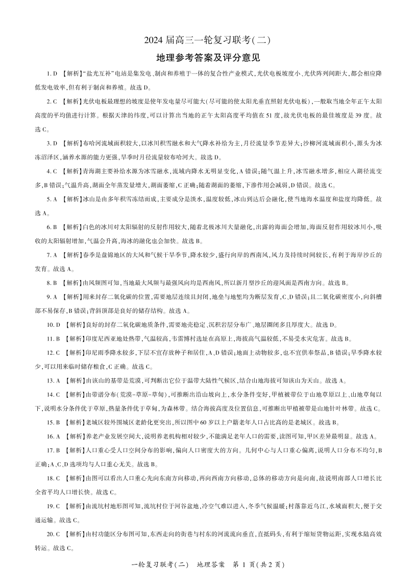 河南省豫北名校2024届高三毕业班一轮复习联考(二)地理答案