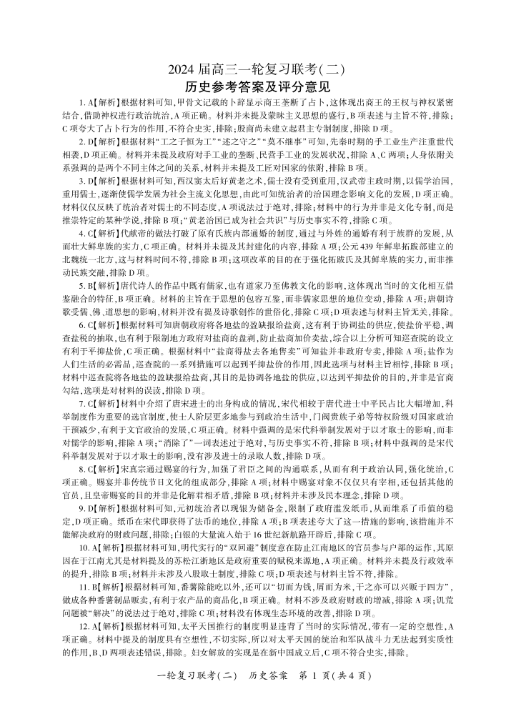 河南省豫北名校2024届高三毕业班一轮复习联考(二)历史答案