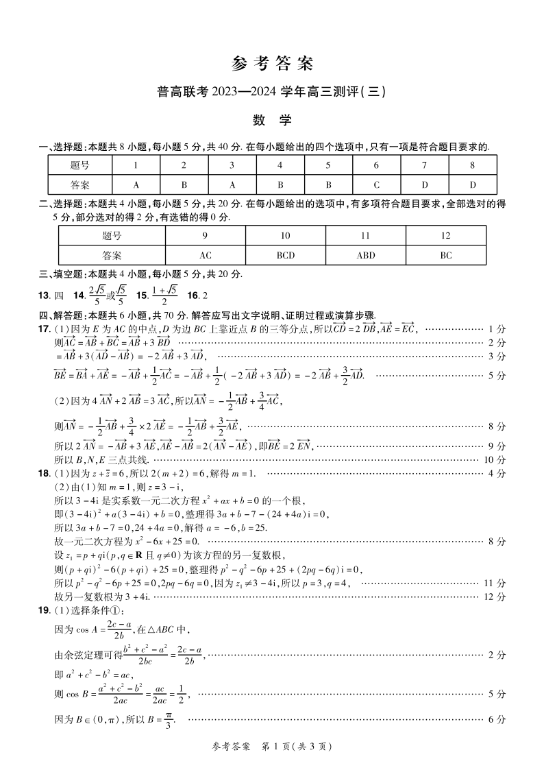 河南省普高联考2023-2024学年高三上学期测评(三)数学答案