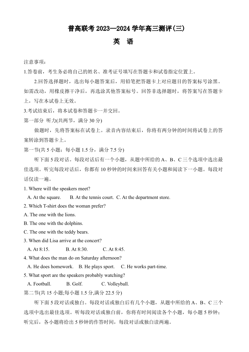 河南省普高联考2023-2024学年高三上学期测评(三)英语