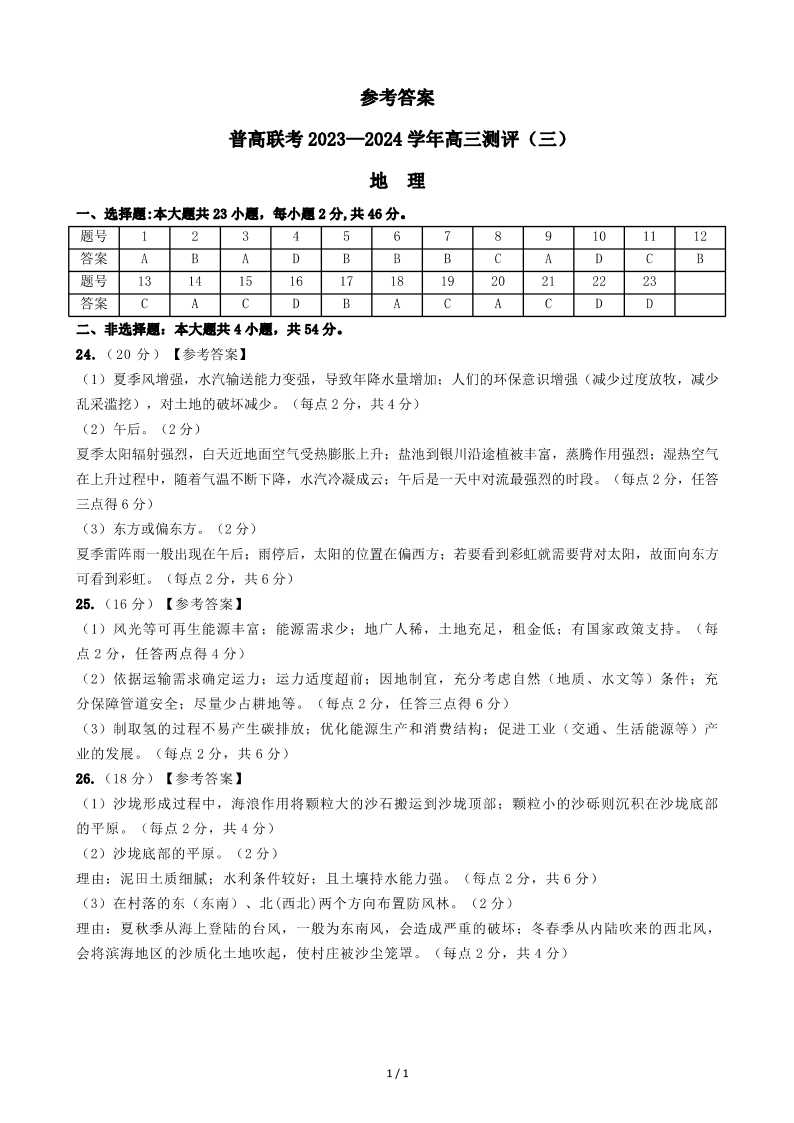 河南省普高联考2023-2024学年高三上学期测评(三)地理答案