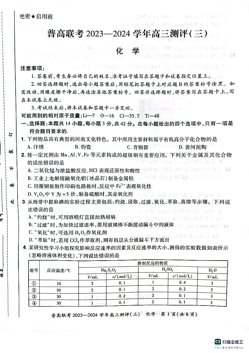 河南省普高联考2023-2024学年高三上学期测评(三)化学