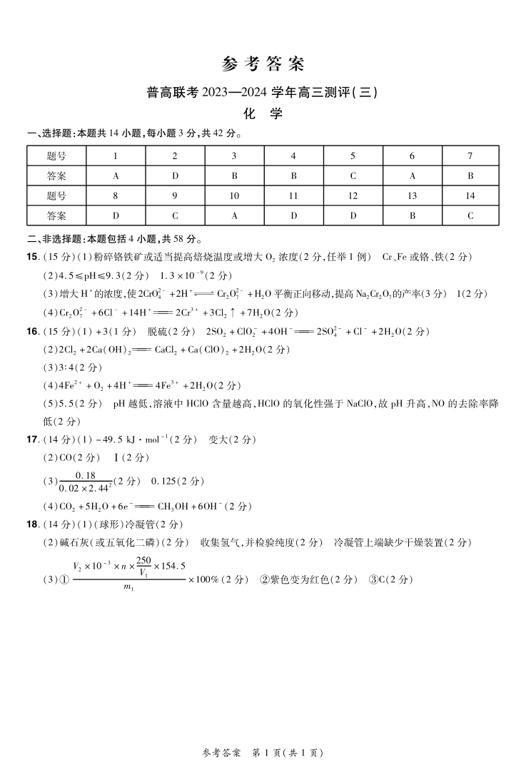 河南省普高联考2023-2024学年高三上学期测评(三)化学答案