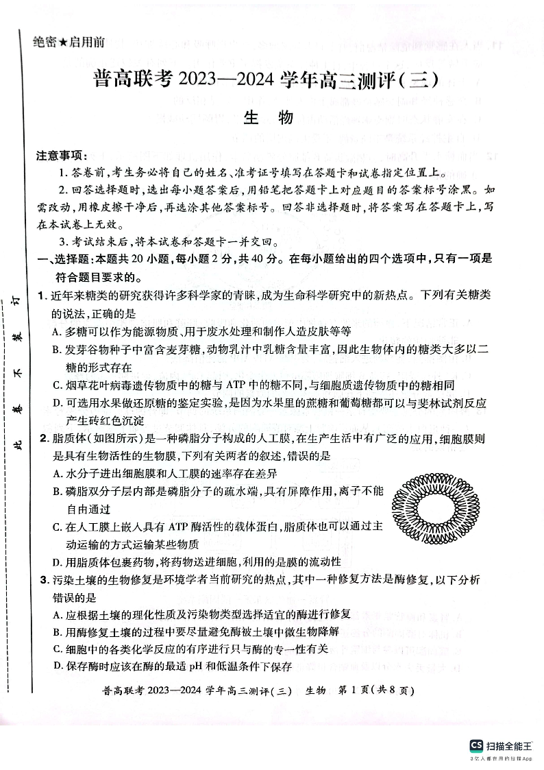 河南省普高联考2023-2024学年高三上学期测评(三)生物