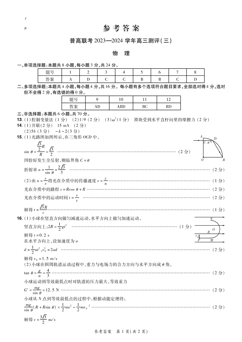 河南省普高联考2023-2024学年高三上学期测评(三)物理答案