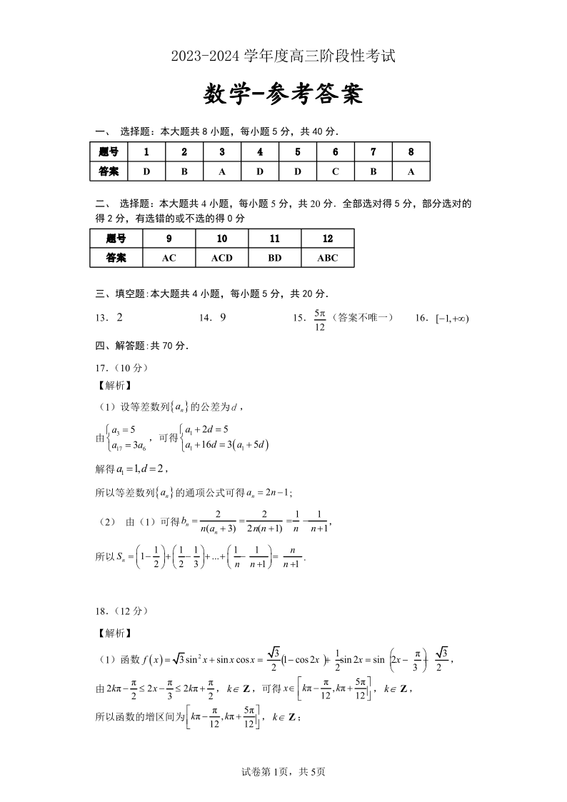 河南省三门峡市2023-2024学年高三上学期10月阶段性考试(期中)数学答案
