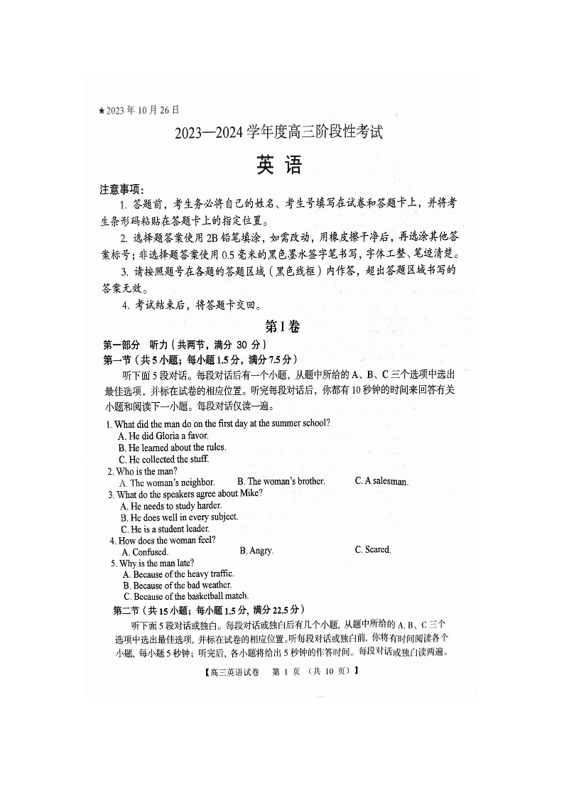 河南省三门峡市2023-2024学年高三上学期10月阶段性考试(期中)英语
