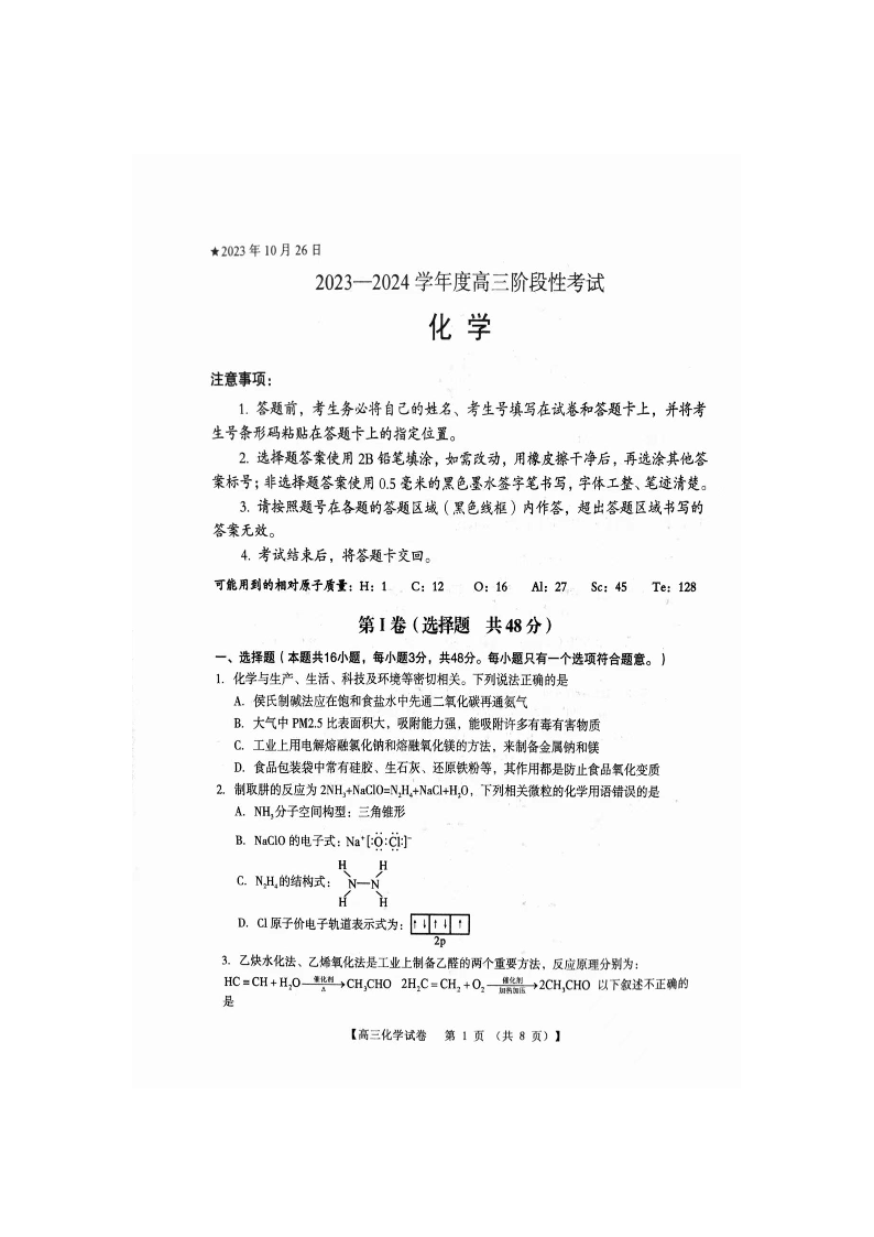 河南省三门峡市2023-2024学年高三上学期10月阶段性考试(期中)化学