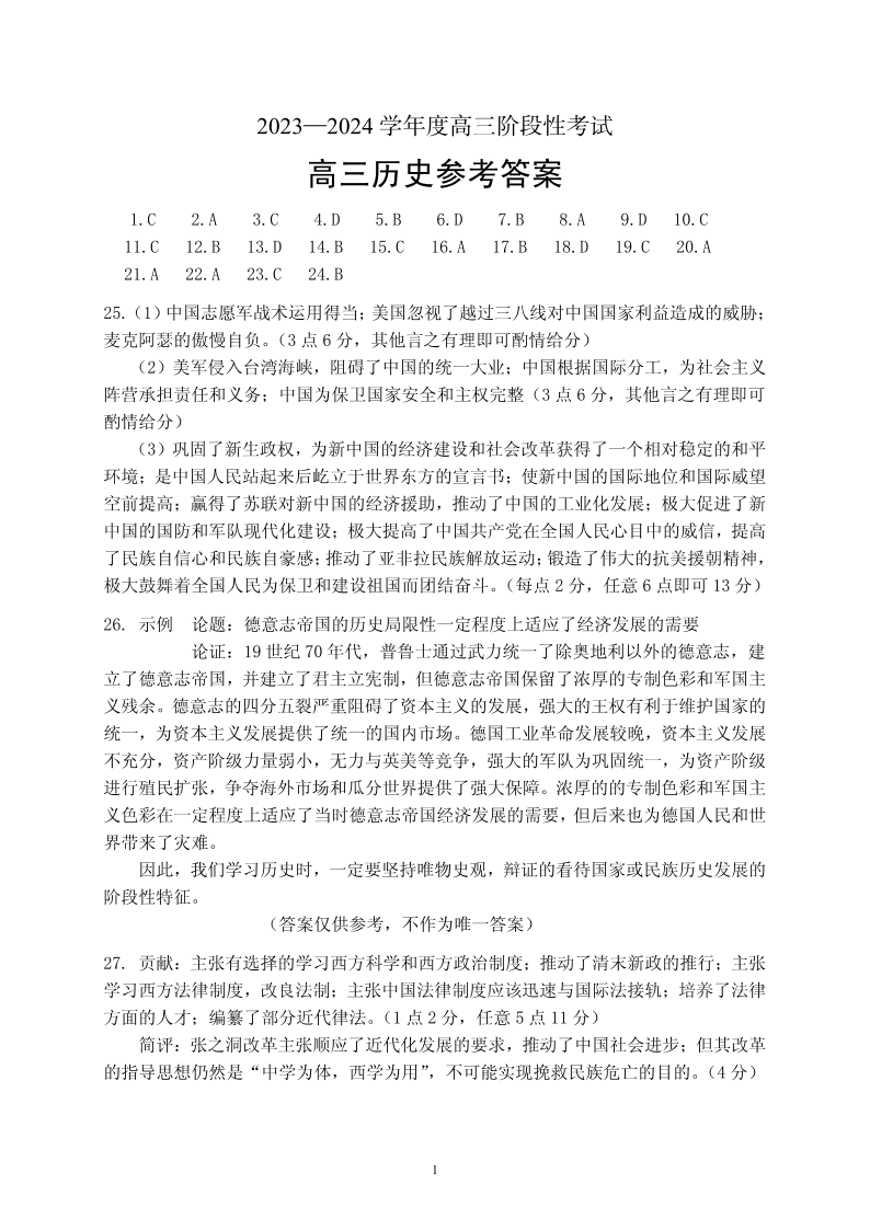 河南省三门峡市2023-2024学年高三上学期10月阶段性考试(期中)历史答案