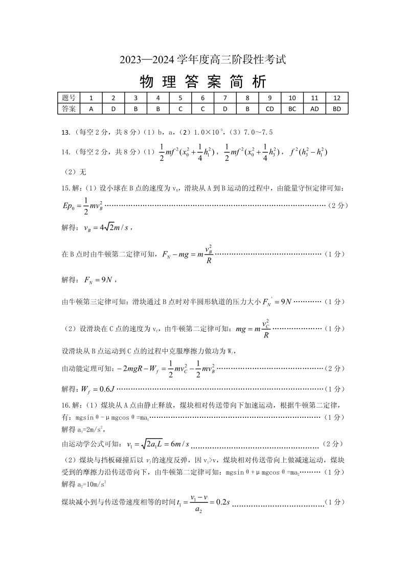 河南省三门峡市2023-2024学年高三上学期10月阶段性考试(期中)物理答案