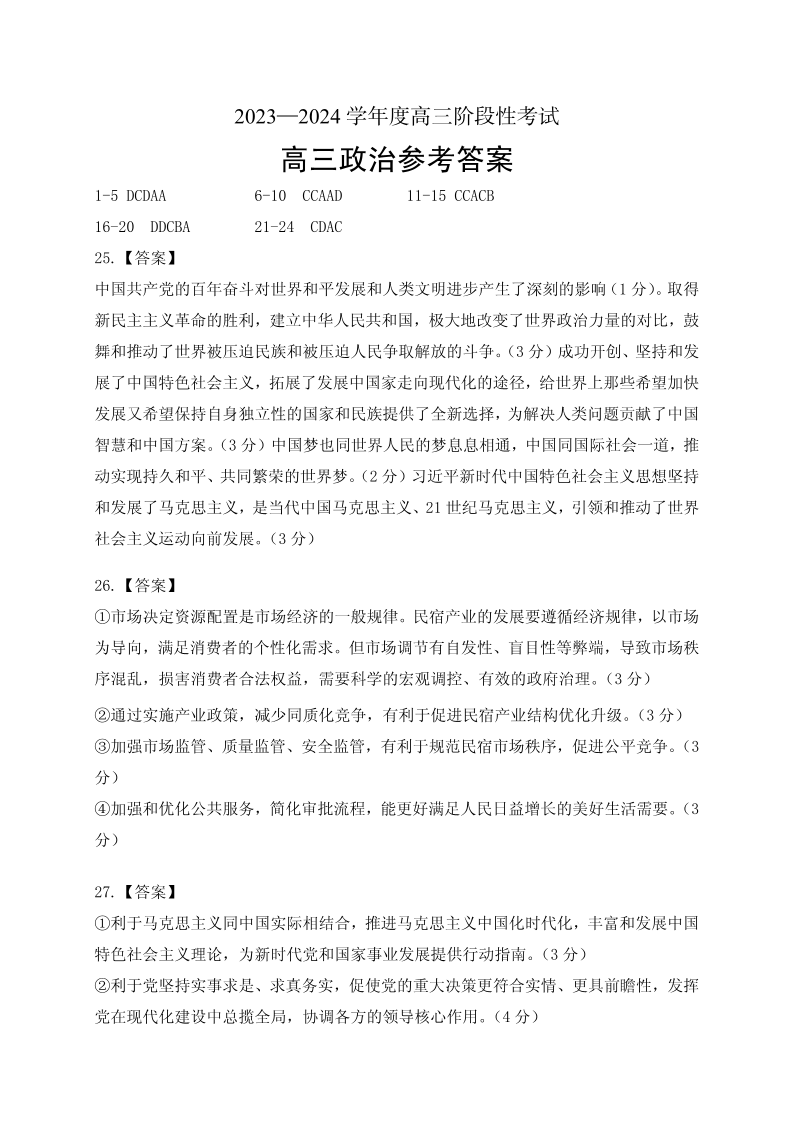 河南省三门峡市2023-2024学年高三上学期10月阶段性考试(期中)政治答案
