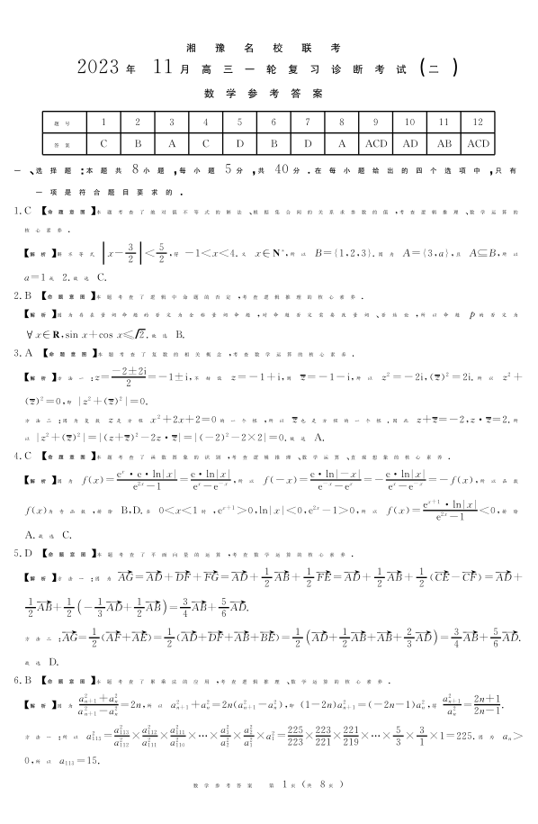 湘豫名校联考2023-2024学年高三11月一轮复习诊断检测(二)数学答案