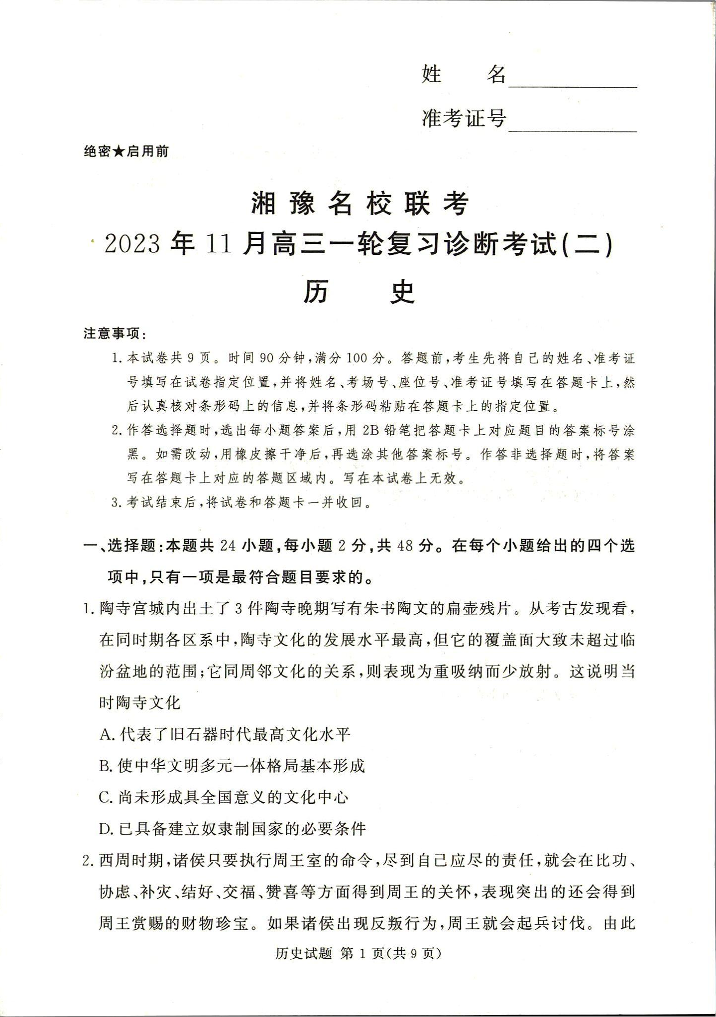 湘豫名校联考2023-2024学年高三11月一轮复习诊断检测(二)历史试题