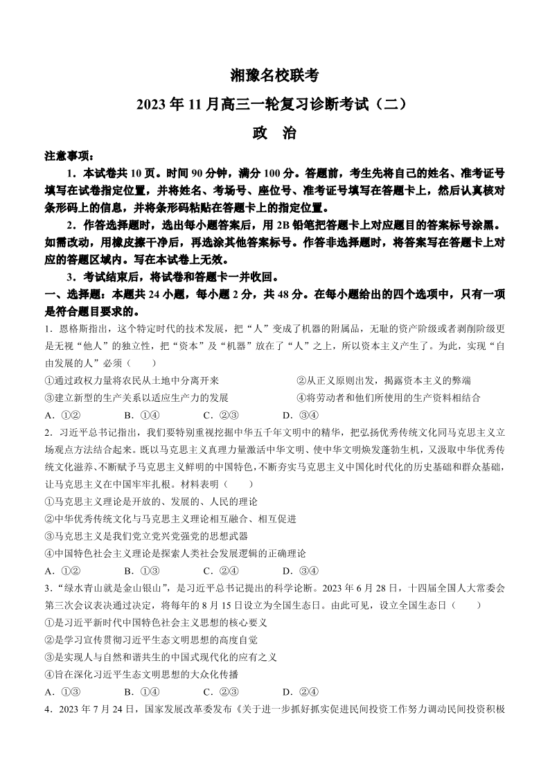 湘豫名校联考2023-2024学年高三11月一轮复习诊断检测(二)政治