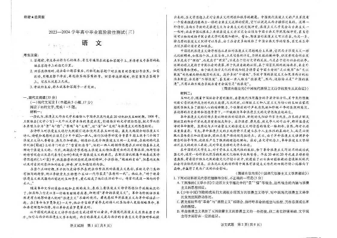 河南省天一大联考2023-2024学年高三上学期阶段性测试(三)语文