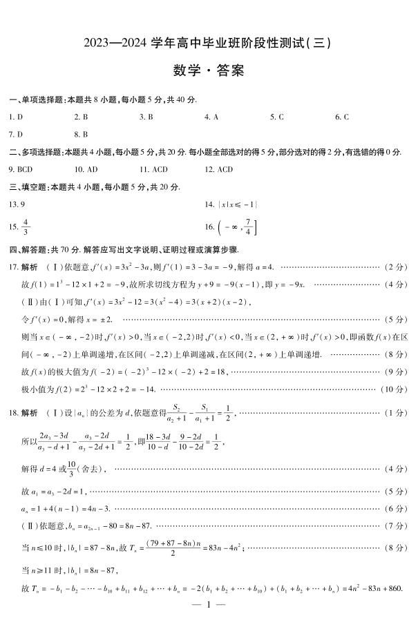 河南省天一大联考2023-2024学年高三上学期阶段性测试(三)数学答案