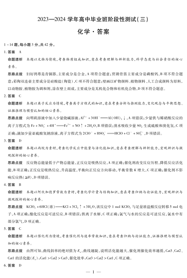 河南省天一大联考2023-2024学年高三上学期阶段性测试(三)化学答案