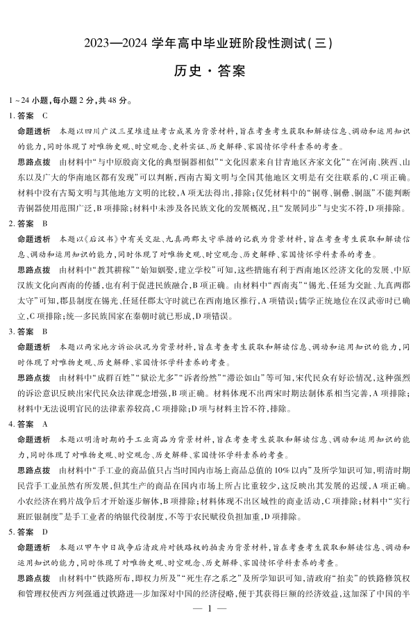 河南省天一大联考2023-2024学年高三上学期阶段性测试(三)历史答案