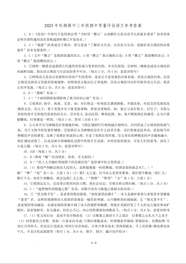河南省南阳市2023-2024学年高三上学期期中考试 语文答案