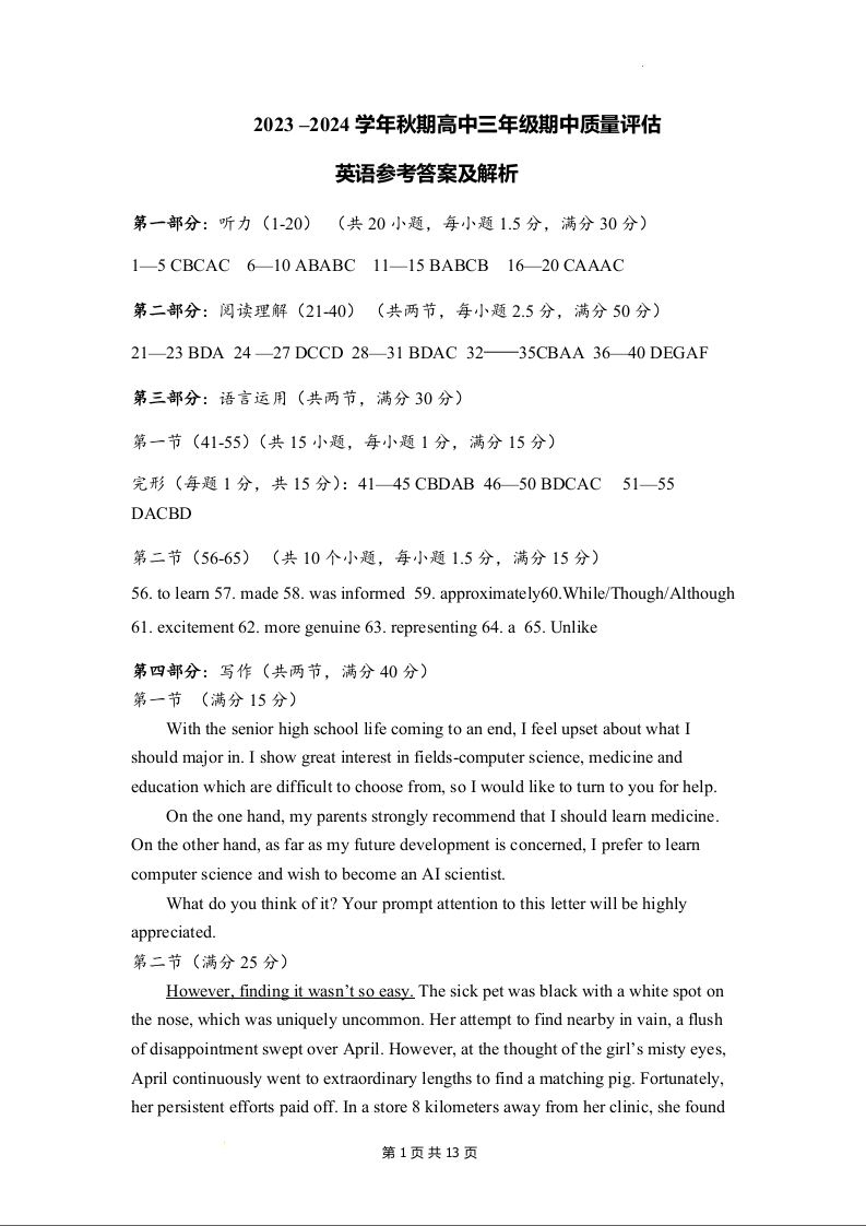 河南省南阳市2023-2024学年高三上学期期中考试 英语答案