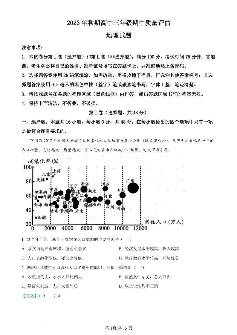 河南省南阳市2023-2024学年高三上学期期中考试 地理答案