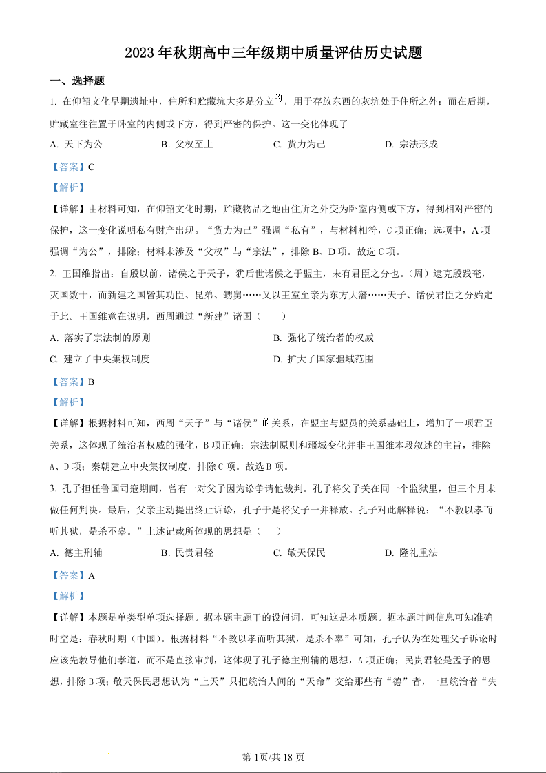 河南省南阳市2023-2024学年高三上学期期中考试 历史答案