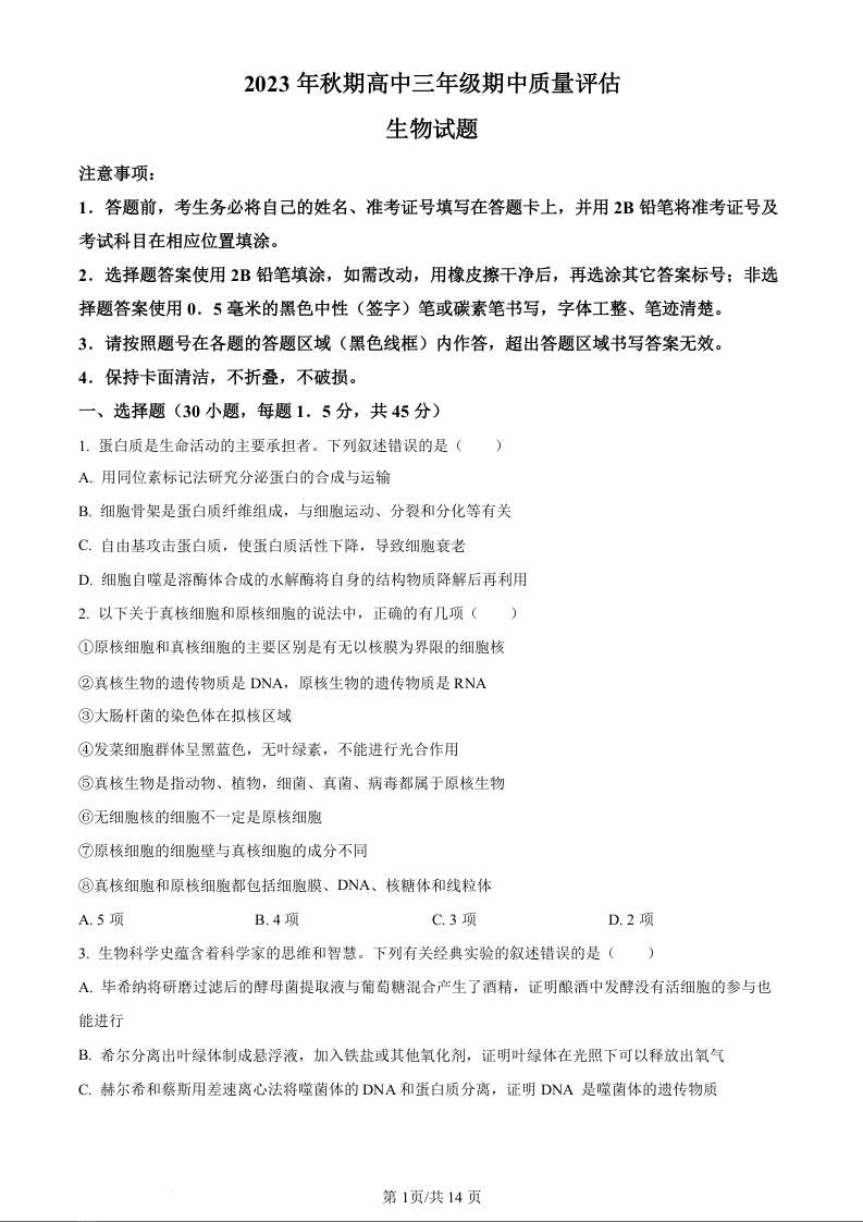 河南省南阳市2023-2024学年高三上学期期中考试 生物