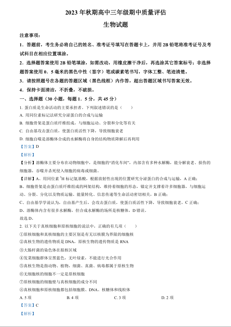 河南省南阳市2023-2024学年高三上学期期中考试 生物答案