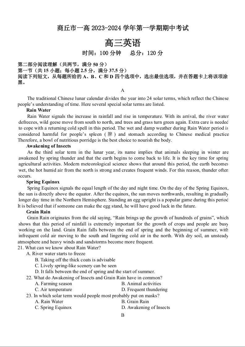 河南省商丘市第一高级中学2023-2024学年第一学期期中考试 英语