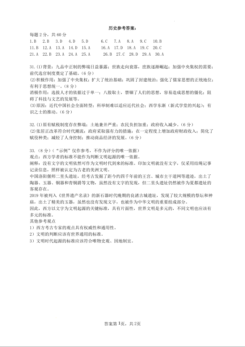 河南省商丘市第一高级中学2023-2024学年第一学期期中考试 历史答案