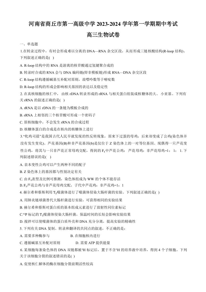 河南省商丘市第一高级中学2023-2024学年第一学期期中考试 生物