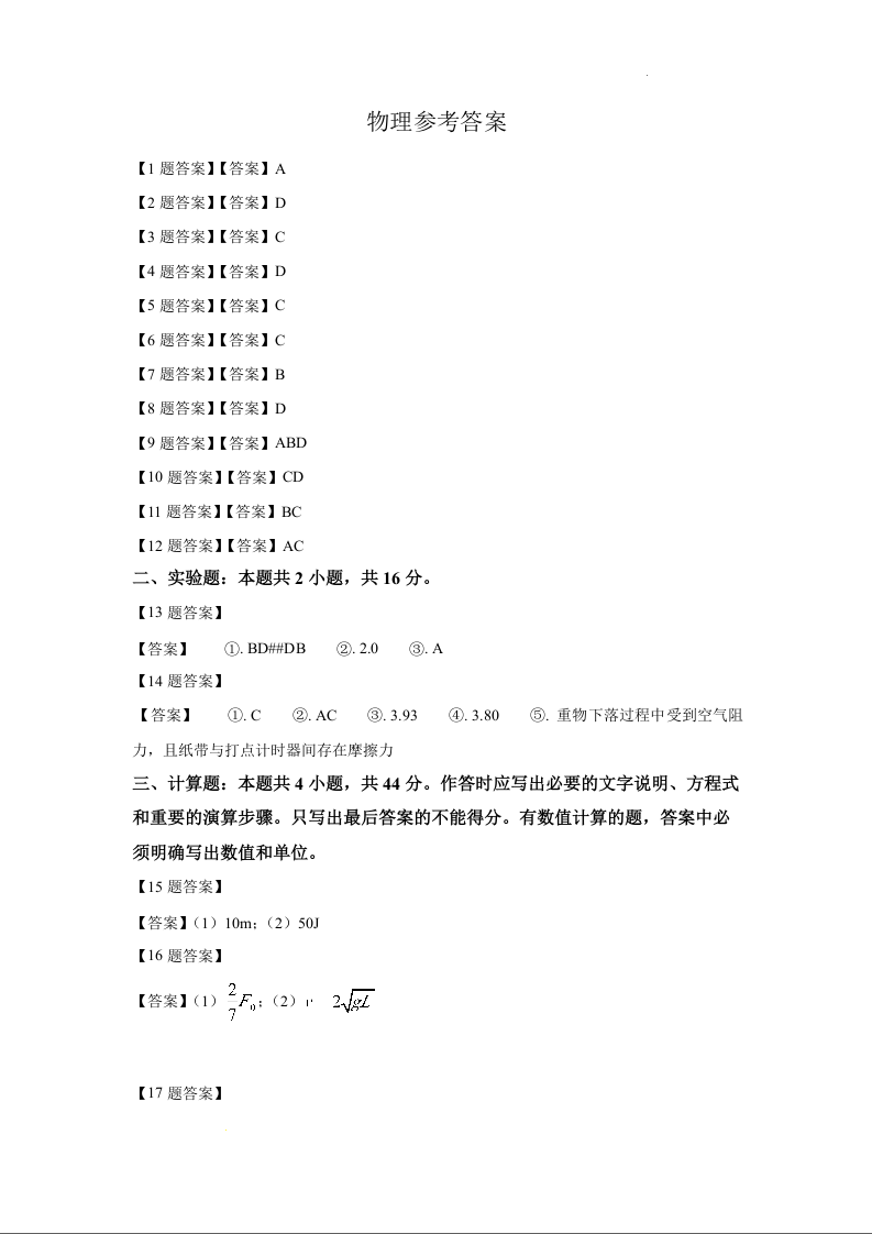 河南省商丘市第一高级中学2023-2024学年第一学期期中考试 物理答案