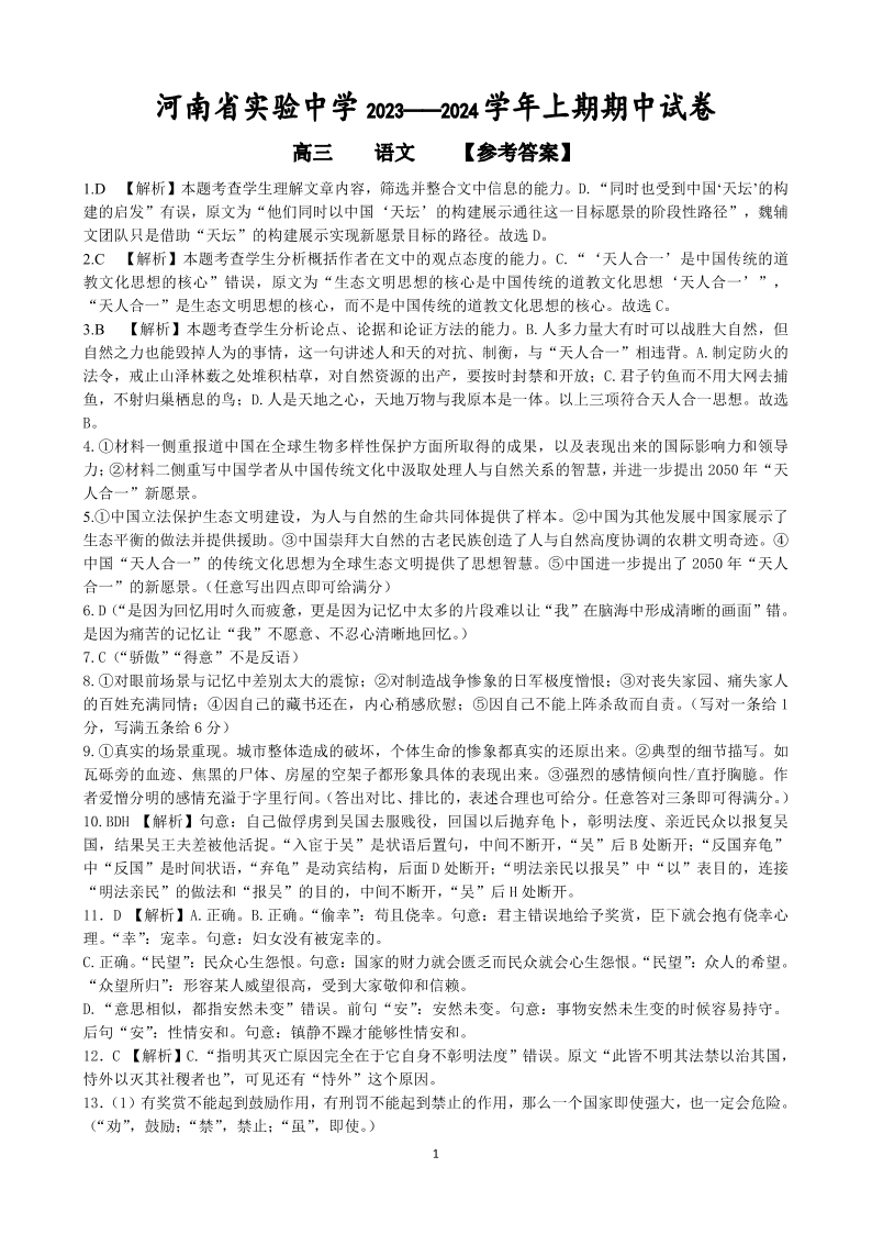 河南省实验中学2023-2024学年高三上学期期中考试 语文答案