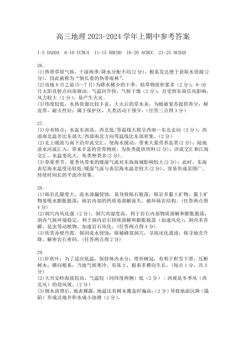 河南省实验中学2023-2024学年高三上学期期中考试 地理答案