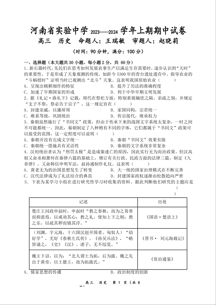 河南省实验中学2023-2024学年高三上学期期中考试 历史