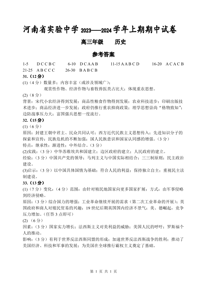 河南省实验中学2023-2024学年高三上学期期中考试 历史答案