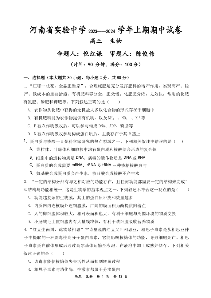 河南省实验中学2023-2024学年高三上学期期中考试 生物